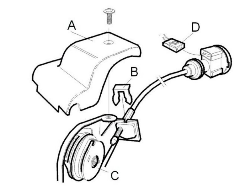 - Unhook the cable from the throttle control bobbin (C) and remove from the bracket.