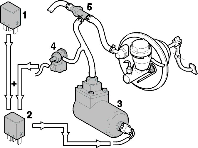 Note! When the ignition is on (engine not started) and a vacuum is requested, the electronic accessory pump (3) is activated and runs. The pump only runs for a few seconds because of the system relay (1).