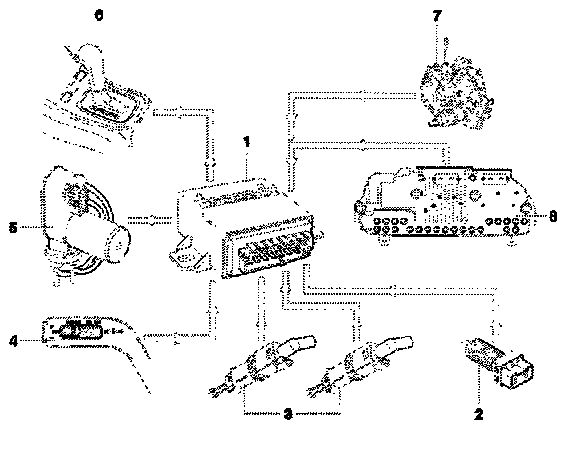 The cruise control module requires information about the actual speed of the vehicle. This information is obtained from the speedometer (8). In cars with manual transmissions, the mechanical movement of the speedometer cable is converted into a speed- related pulsed frequency. This signal is then transmitted to the control module. In cars with automatic transmissions, this information is provided by the Aisin Warner transmission (7). This cable is routed to the instrument panel.