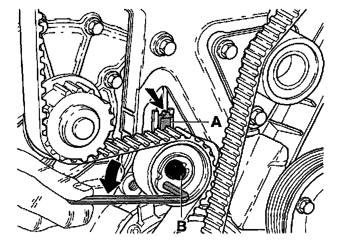 - Tighten the bolt (B) to 20 Nm without moving the tensioner