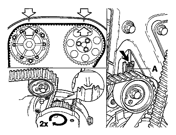 - Check the adjustment of the tensioner (indicator pin (A) in the middle)