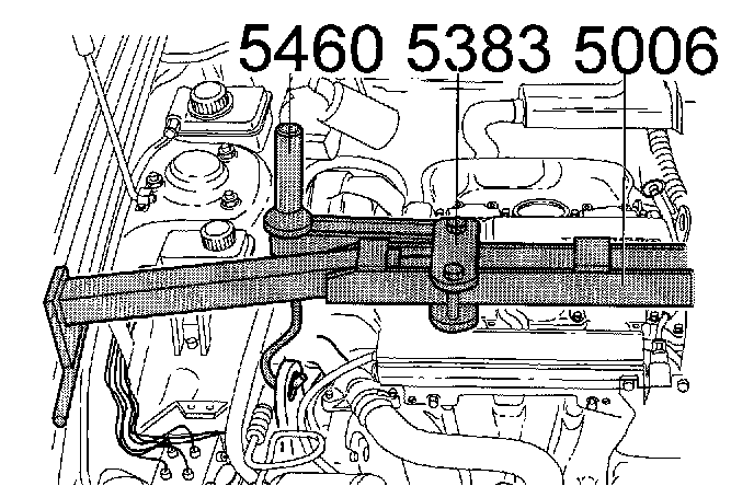 Position lifting beam 999 5006 slightly in front of the front lifting eyelet for the engine. Use lifting arm 999 5383 and lifting hook 999 5460 to raise the front of the engine a few millimeters.