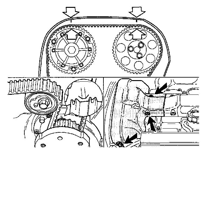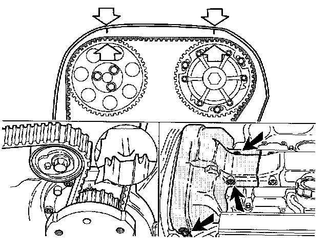 Turn the crankshaft a further l/4 turn clockwise and then back again until the markings correspond. The markings are illustrated. Remove the upper timing cover.