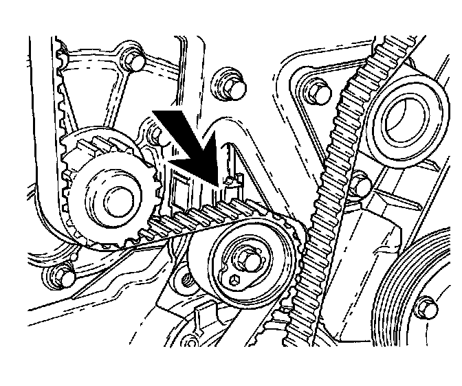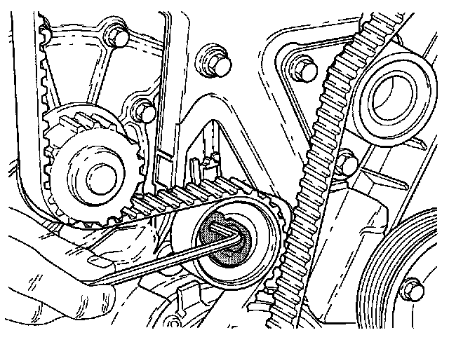 - Carefully turn the crankshaft clockwise until the timing belt is tensioned. The belt must be tensioned between the intake camshaft pulley, the idler pulley and the crankshaft