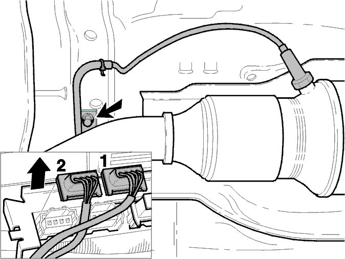 Remove the relay cover. Disconnect the connector from front (1) or rear (2) heated oxygen sensor (HO2S). Remove the wiring clamp.
