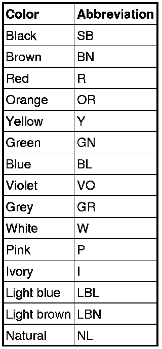 If the cable color code has two colors, it appears in abbreviated form as follows: