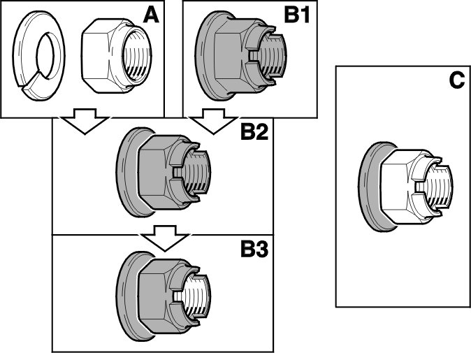 Note! If the lock nut mentioned in B1, B2 or B3 has been installed, and if it is loose or has been replaced during a repair, version (C) must be used.