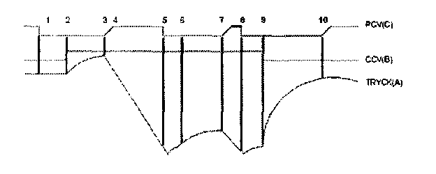 3-4. The EVAP canister shut-off valve (B) remains closed, the evaporative emission system (EVAP) valve (C) starts to pulse. The pressure (A) in the fuel tank now starts to drop quite quickly. If the pressure does not drop quickly there is a major leak in the system. Diagnostic trouble code (DTC) ECM-4308 leak diagnostic major leak is then stored. If the pressure drops too quickly instead, the fuel tank level is too high and the diagnostic is cancelled