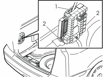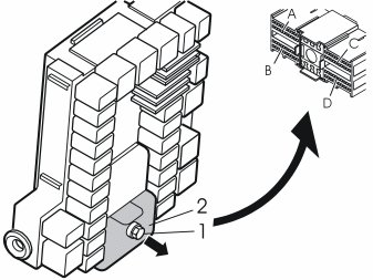 - Remove the rear electronic module. First open the catch (1) on the top of the module. Fold the module forward. Lift the module from the mountings (2).