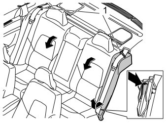 - Remove the seat belts from the guides (1) on the right and left-hand side cushions