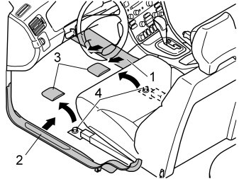 - Remove the cover (3) and the screws (4) for the front mountings in the left-hand front seat.