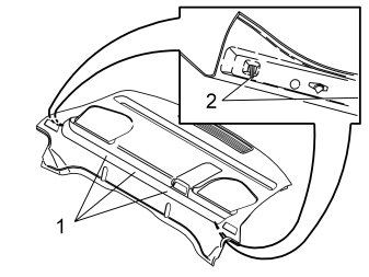 - Lift up the parcel shelf further until the locating pins (2) release from their holes
