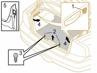 - Remove the clips (1) and the plastic nut in the left front side panel in the cargo compartment. It is easiest to access the front upper clip from the side of the rear seat