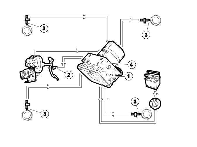 The ABS control module then activates the valves in the hydraulic modulator and checks the individual wheel brake forces by raising, maintaining or lowering the pressure individually to stabilize the car. The brake pedal moves up and down during activation. If the driver presses the brake pedal during stability control, the control module, through the pedal pressure sensor (6) in the power brake booster, will take account of the pressure exerted by the driver in the stability control.