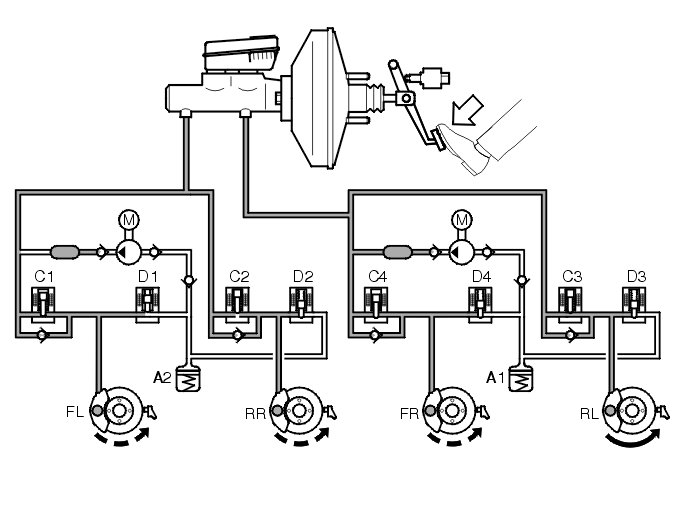 If the wheel locks anyway, the outlet valve opens and the brake fluid is allowed back to the accumulators resulting in a reduction in the brake circuit pressure (pressure release, see the left front wheel - FL). This reduces the hydraulic pressure and braking effect, allowing the wheel to accelerate. The hydraulic pump returns the brake fluid from the accumulators to the master cylinder.