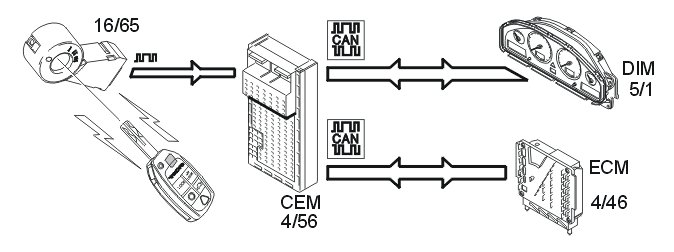 If the ignition key is turned to position 0 but the key is not removed from the ignition switch, the engine control module (ECM) will wait for a while but then send a command to the central electronic module (CEM) to activate the immobilizer, despite the fact that the key has not been removed from the ignition switch.