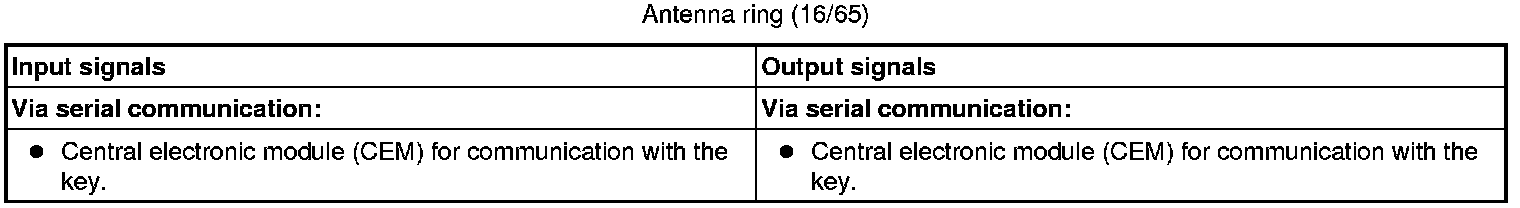 The tables below summarize the input and output signals to the units in the system for the immobilizer. The signal types are divided into directly connected signals, serial communication and controller area network (CAN) communication.