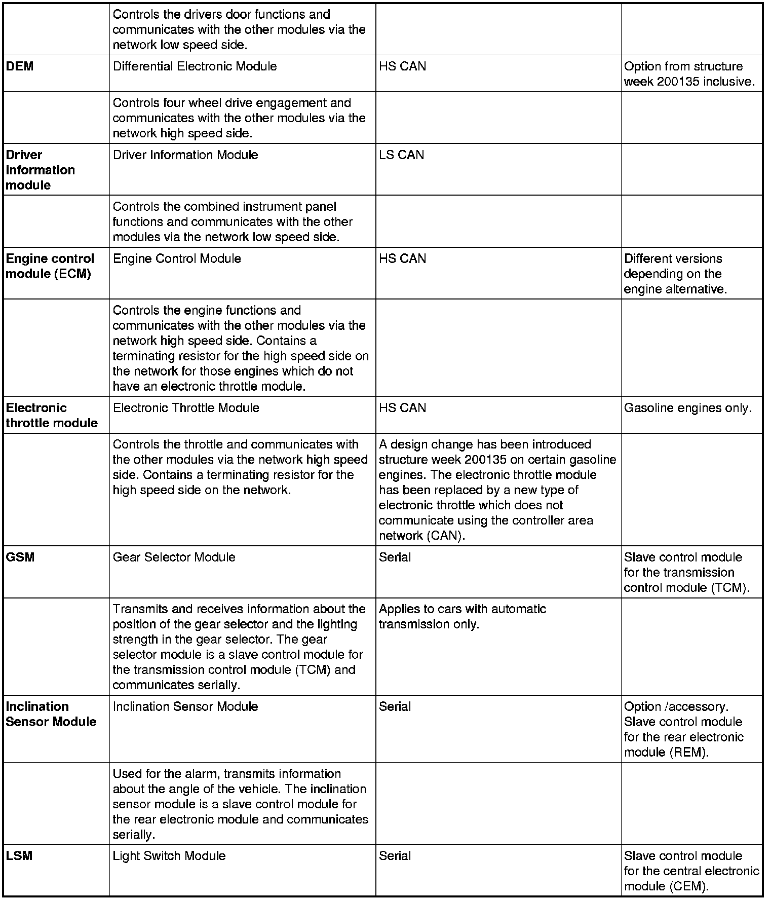 The number of control modules in the CAN varies depending on the level of equipment, the car model and the structure week. The description applies to the structure week 199815-200149. The structure week and the manufacture week are not necessarily the same week. The week of manufacture is the week in which the car was manufactured in the factory. The content of the car is guided by the structure week A structure week can extend over many manufacture weeks. The structure week is specified in the format YYYYWW.