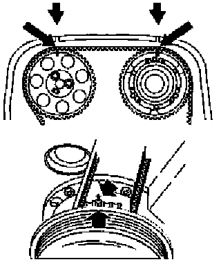 Install the timing gear pulley on the intake camshaft with two screws, but do not tighten. Adjust the timing gear pulleys so that the markings on the timing gear pulleys/upper timing cover correspond.