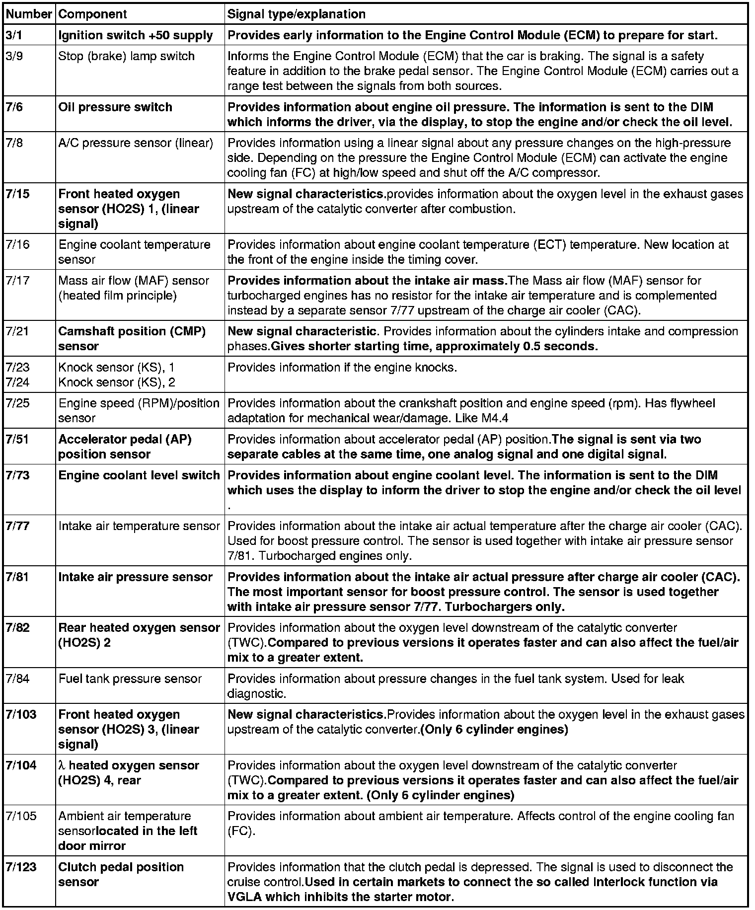 Sensors and functions which are different to previous types are marked in