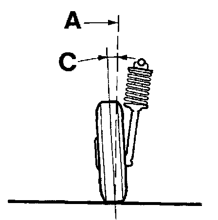 Camber (C) refers to the wheel leaning in or outwards. The angle is considered positive if the wheel leans outwards and negative if the wheel leans inwards.