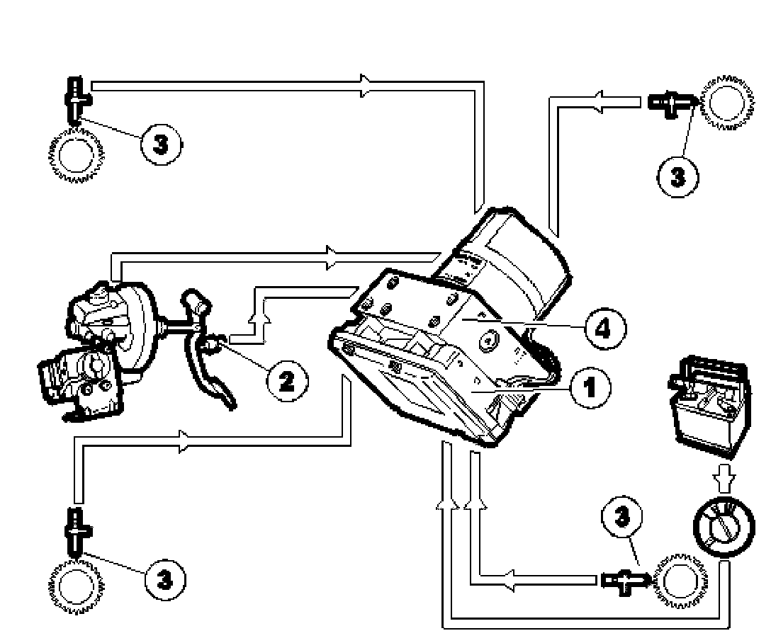 The ABS control module then activates the valves in the hydraulic modulator and checks the individual wheel brake forces by raising, maintaining or lowering the pressure individually to stabilize the car. The brake pedal moves up and down during activation. If the driver presses the brake pedal during stability control, the control module, through the pedal pressure sensor (6) in the power brake booster, will take account of the pressure exerted by the driver in the stability control.