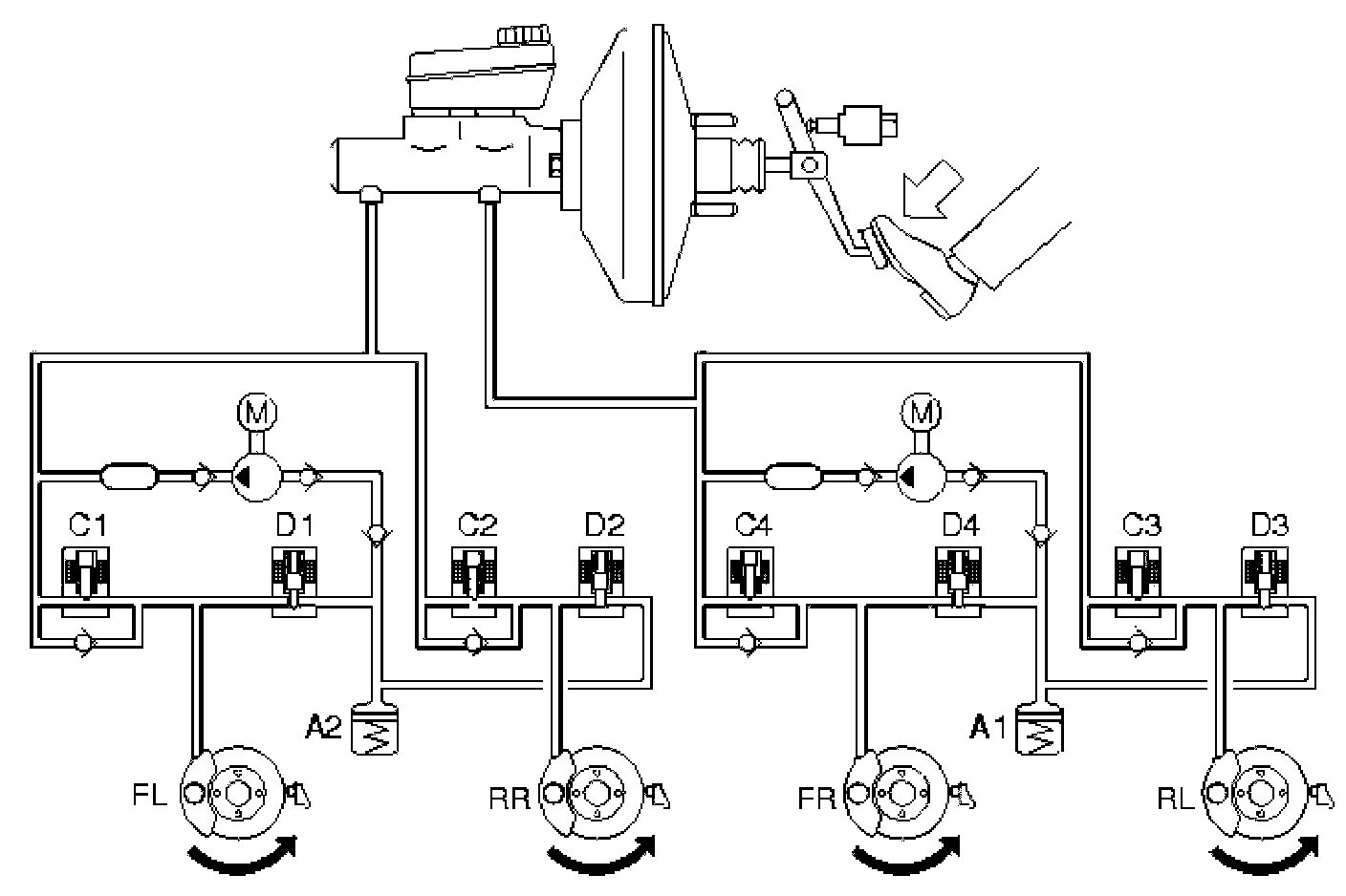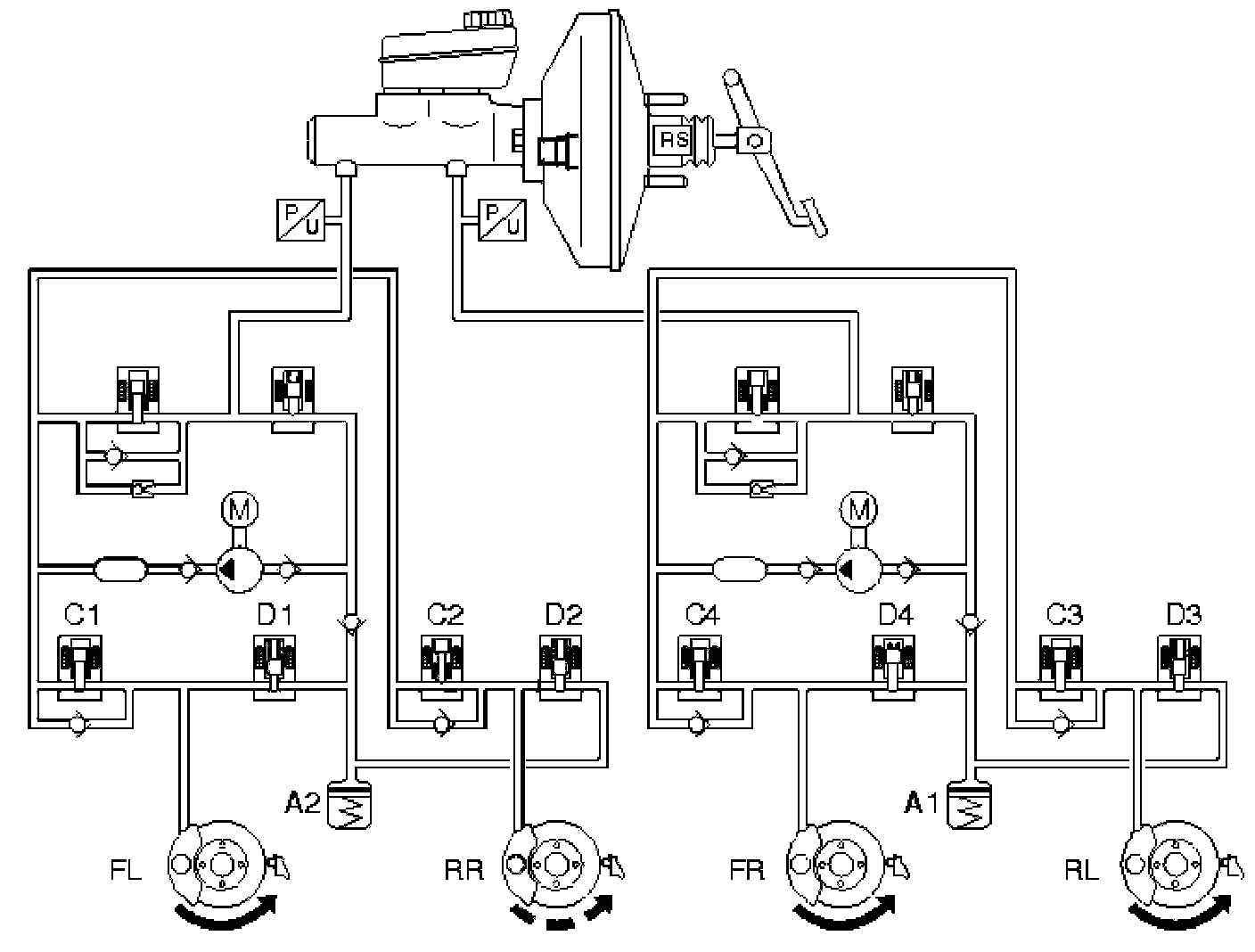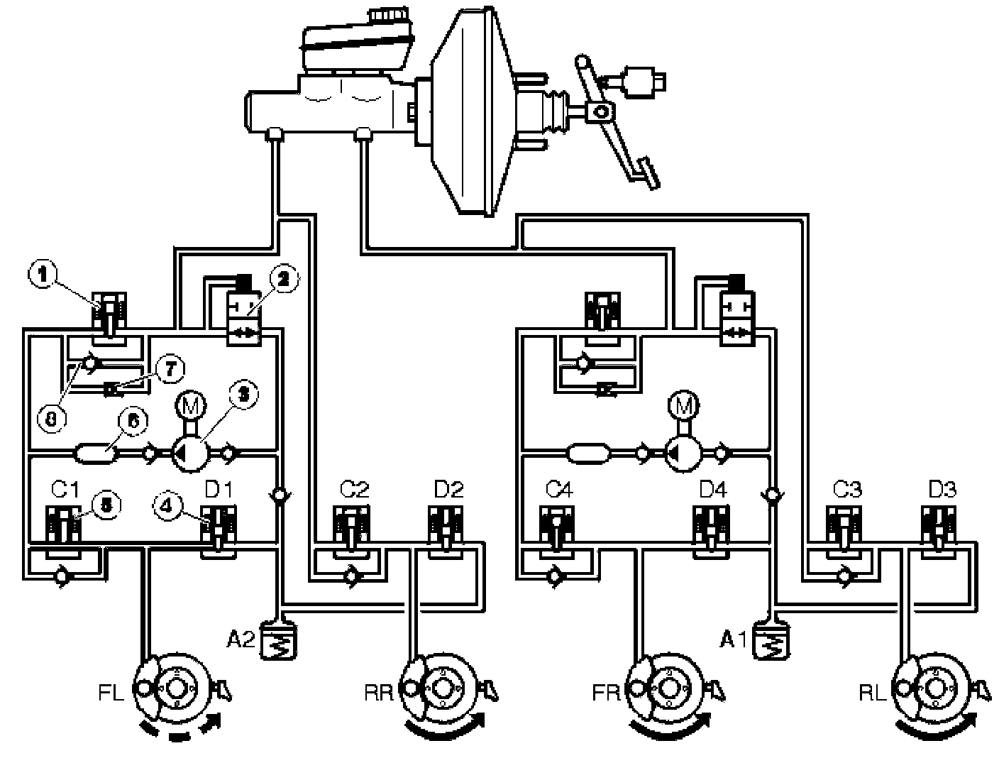 If the wheel locks anyway, the outlet valve opens and the brake fluid is allowed back to the accumulators resulting in a reduction in the brake circuit pressure (pressure release, see the left front wheel - FL). This reduces the hydraulic pressure and braking effect, allowing the wheel to accelerate. The hydraulic pump returns the brake fluid from the accumulators to the master cylinder.