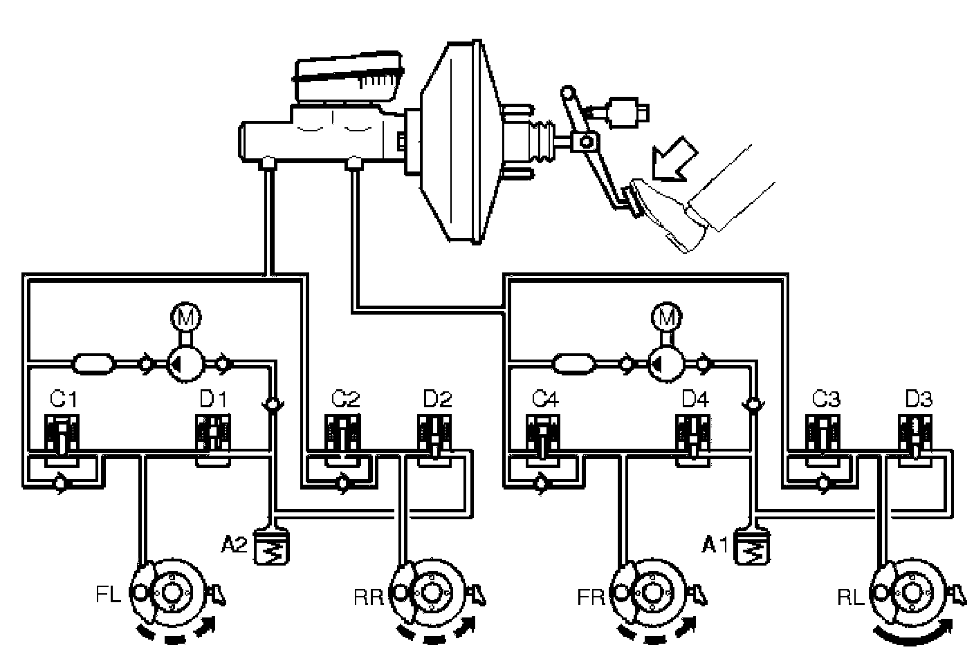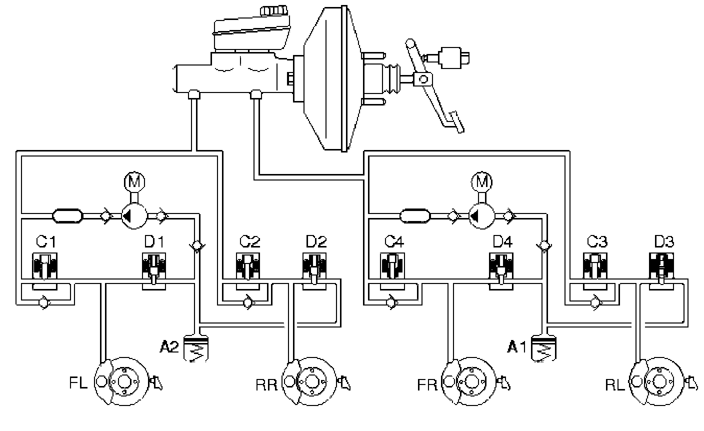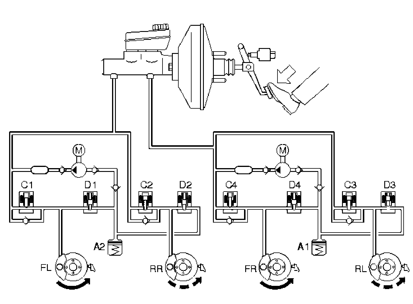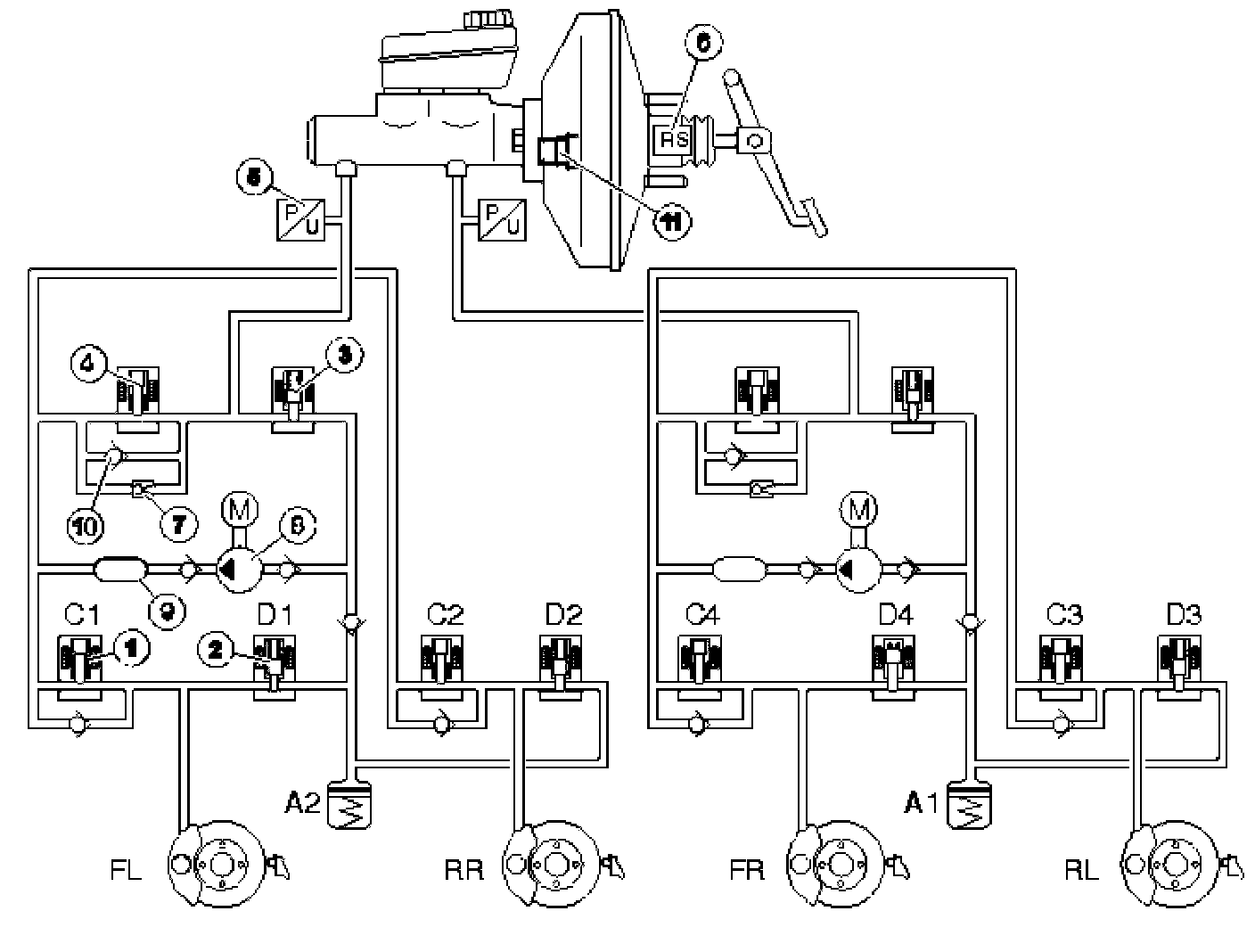 If the wheel locks anyway, the outlet valve opens and the brake fluid is allowed back to the accumulators resulting in a reduction in the brake circuit pressure (pressure release, see the left front wheel - FL). This reduces the hydraulic pressure and braking effect, allowing the wheel to accelerate. The hydraulic pump returns the brake fluid from the accumulators to the master cylinder.