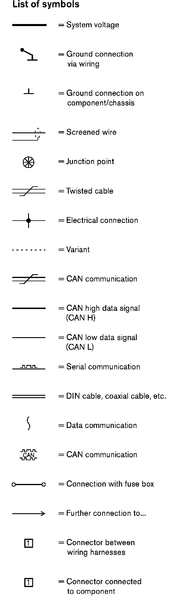 At the end there is a list of components, where, with the help of the component designation, you can read off the name of the component, for example, 3/2 = light switch. Diagram Legend