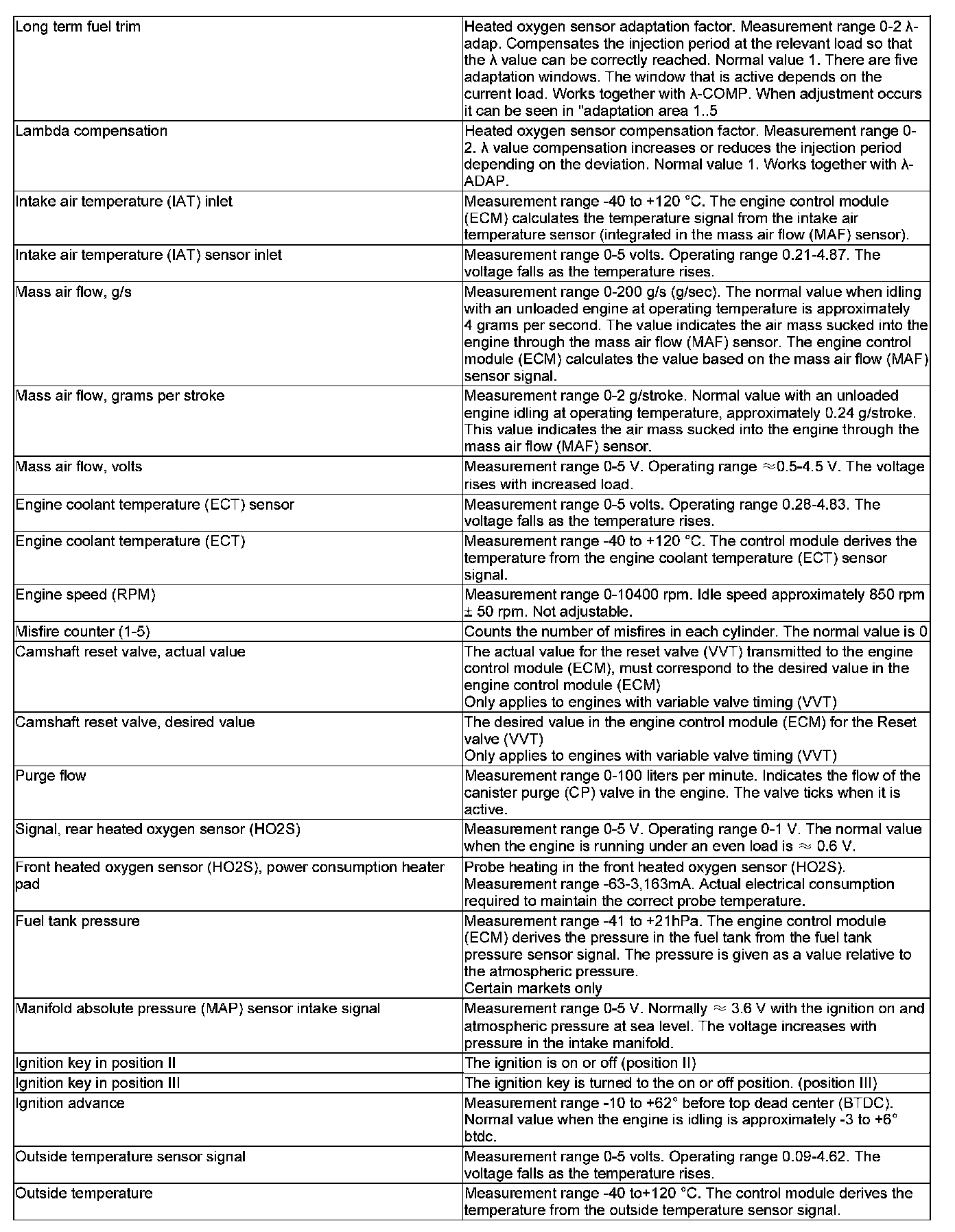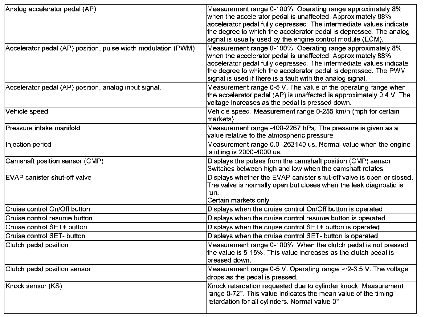 Pinout Values and Diagnostic Parameters