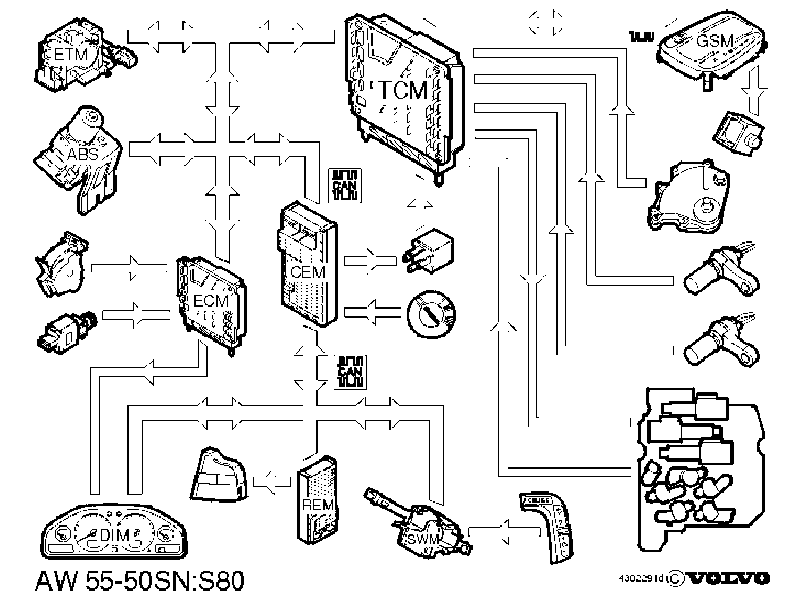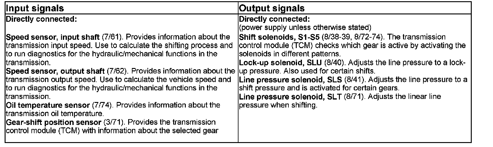The table provided summarizes the input signals to and output signals from the transmission control module (TCM). The signal types are divided into directly connected signals, serial communication and Controller area network (CAN) communication. The following illustration displays the same information with the Volvo component designations.