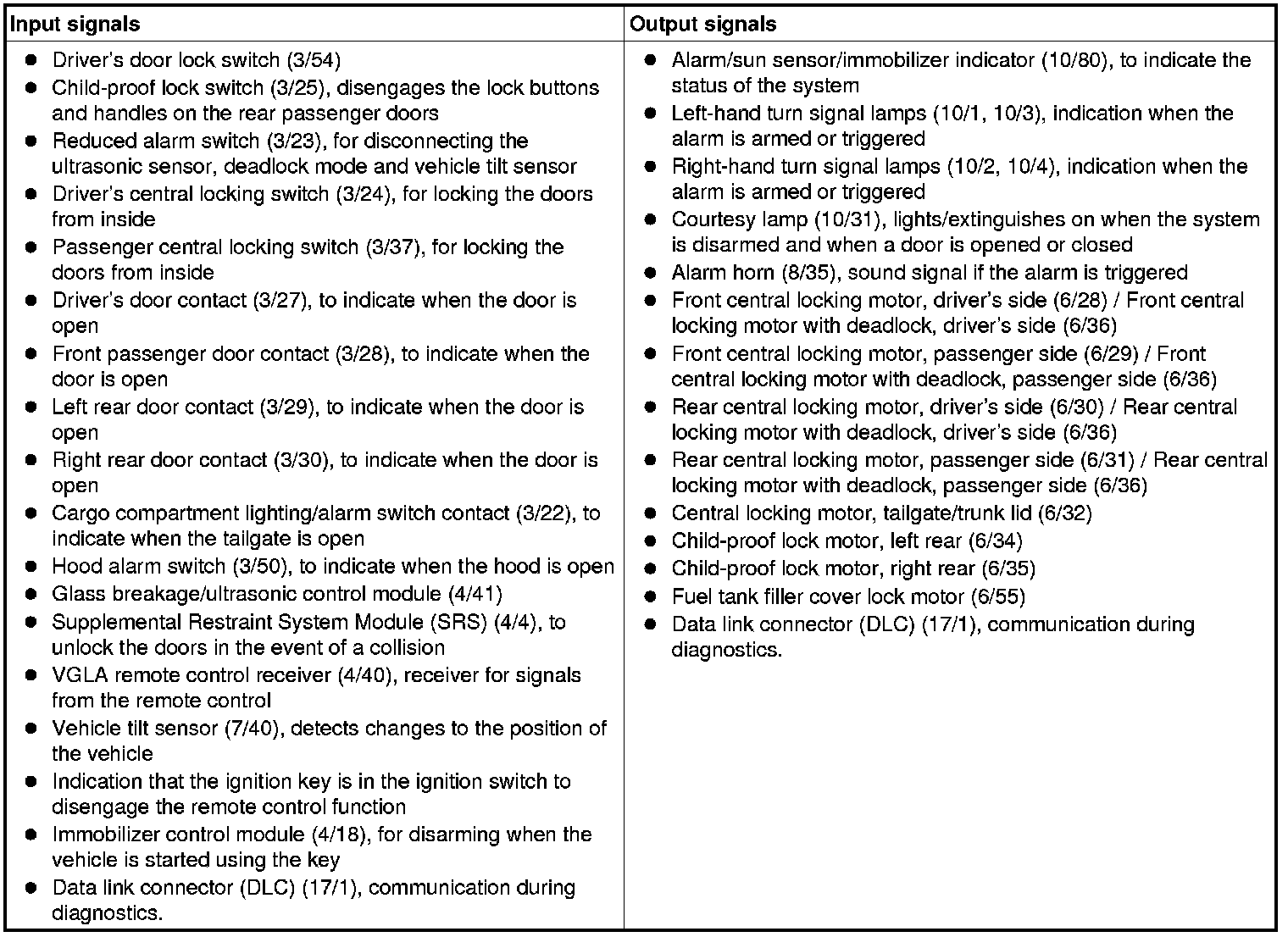 The table below summarizes the input signals to and output signals from the VGLA control module. The illustration below displays the same information with the Volvo component designations.