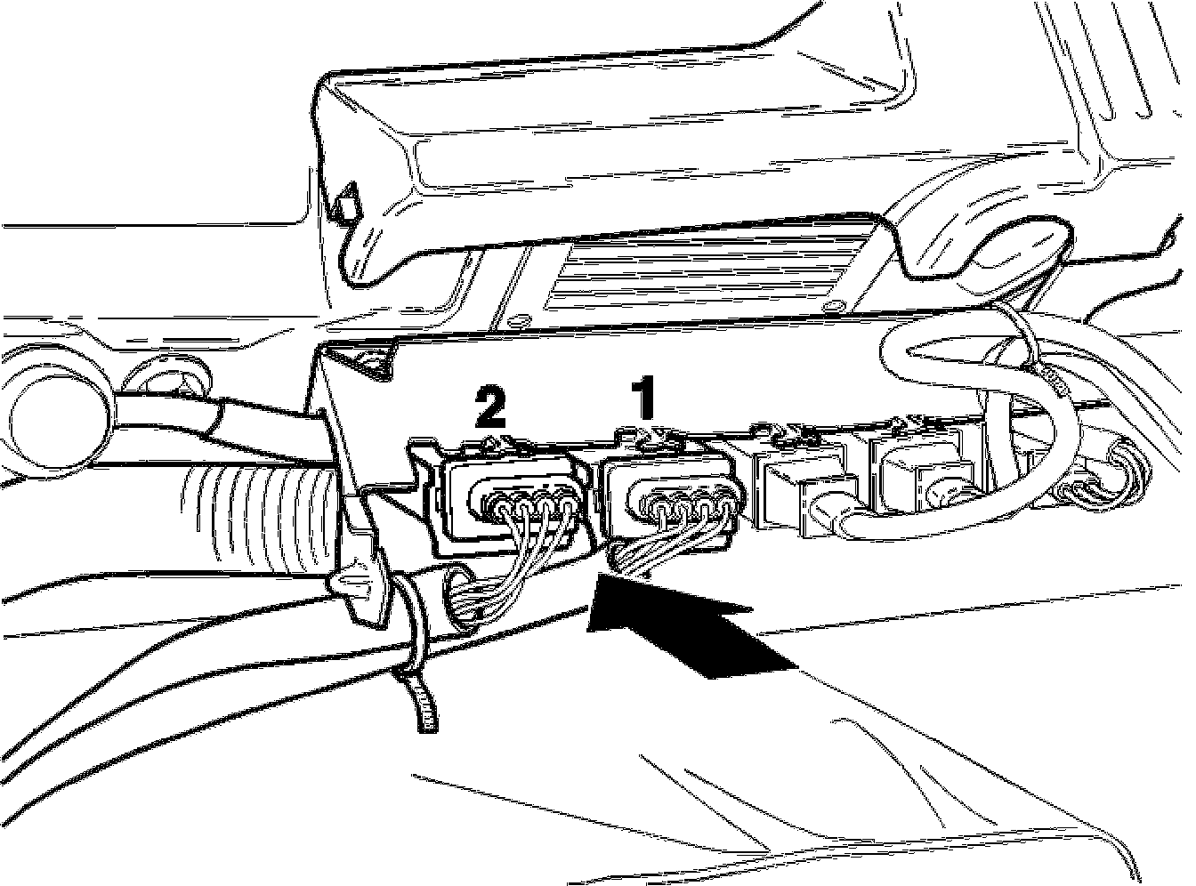 - Remove relay cover and disconnect connector from front (black (2)) or rear (white (1)) heated oxygen sensor (HO2S).