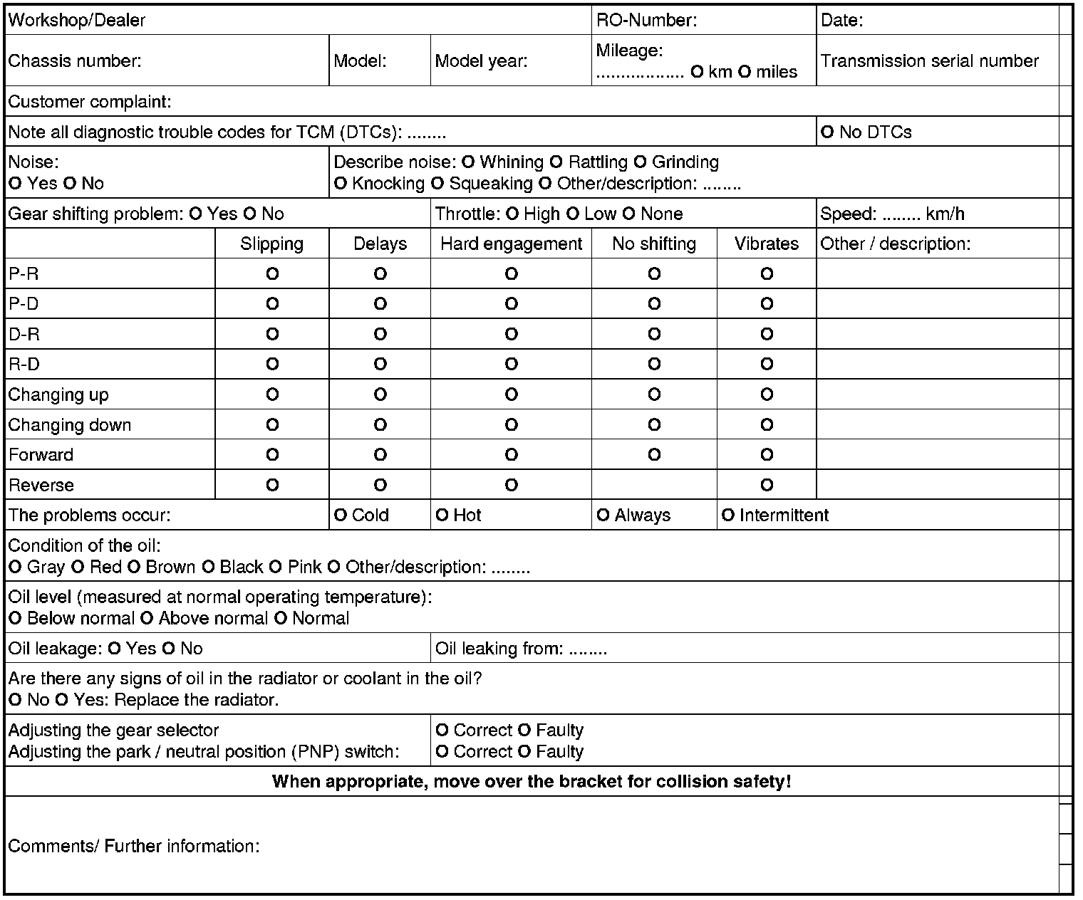 A copy of this diagnostics list must always be returned in a plastic pocket attached to the replaced transmission. Also send a copy to the importer and keep the original. All fields must be completed.