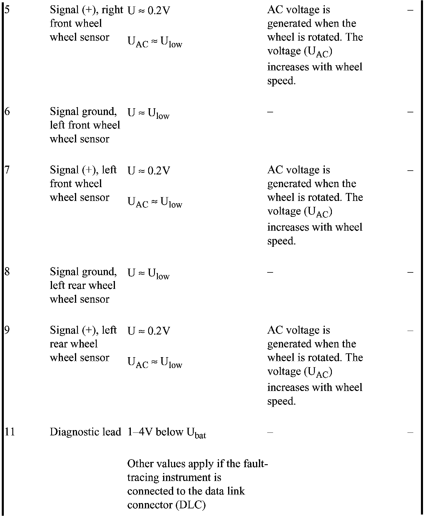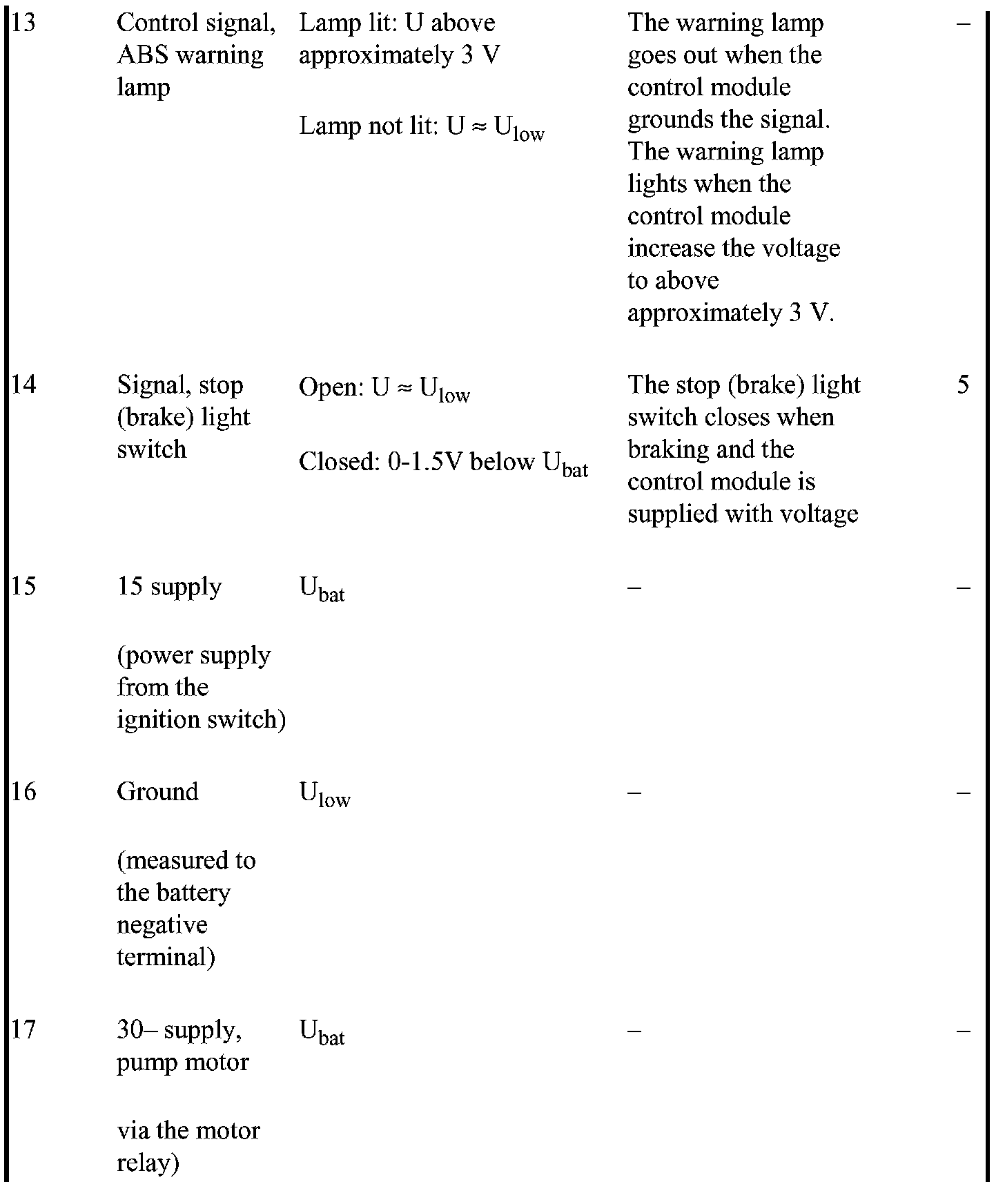 All the values given below are between the terminal stated in column 1 and terminal 16 (ground). This applies unless otherwise indicated in brackets. ABS control module terminals 1-40 correspond to terminals 1-40 on the breakout box.