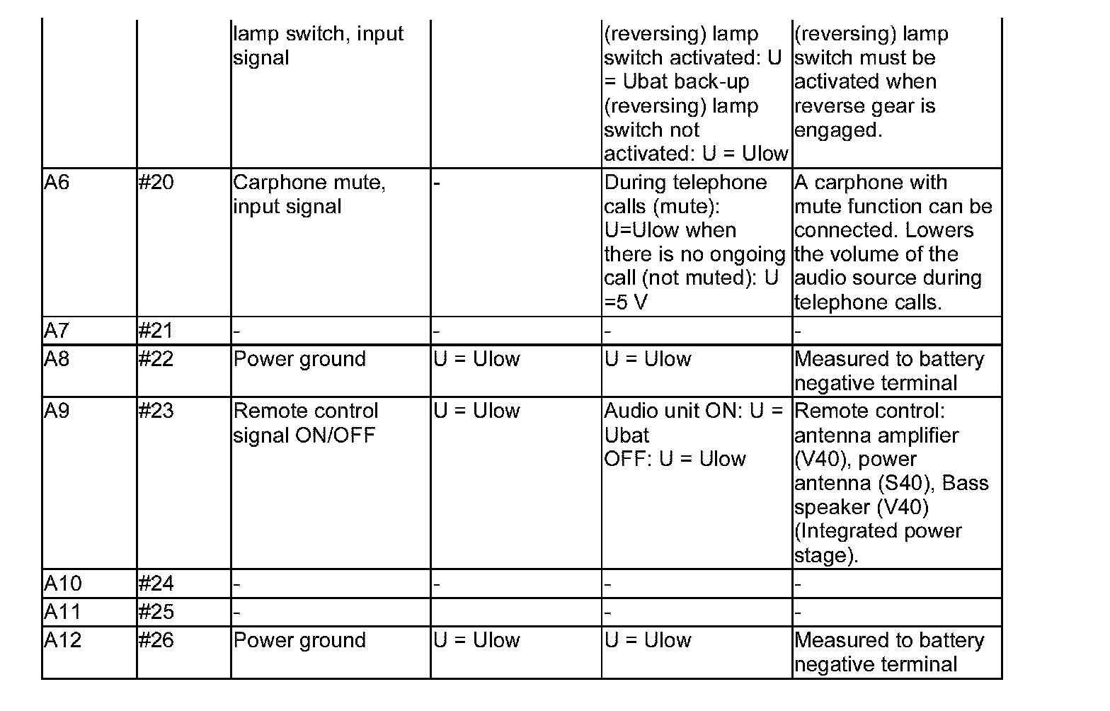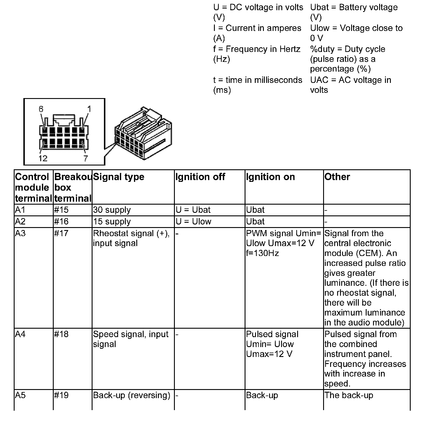 All values listed below are measured between the respective terminal in column 1 (control module terminal)and terminal A12 (power ground) unless stated otherwise in column 6 (Other). It is important to read about the breakout box connection and checking ground terminals before readings are taken.