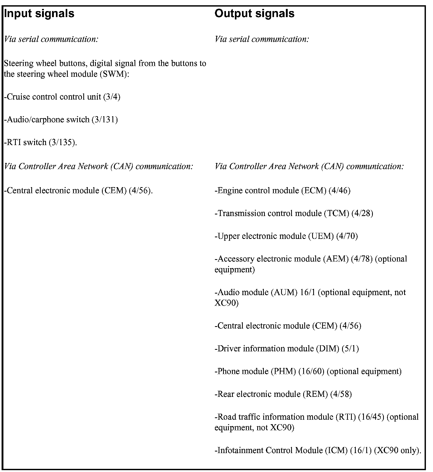The table summarizes the input signals to and output signals from the steering wheel module (SWM). The signal types are divided into directly connected signals, serial communication and Controller area network (CAN) communication. The following illustration displays the same information with the Volvo component designations.