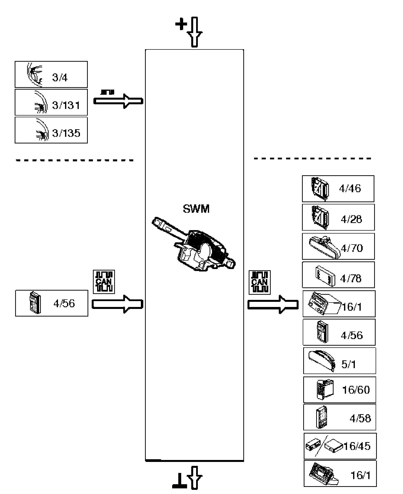 - The steering wheel module (SWM) communicates with directly connected components and communicates with other control modules via the Control Area Network (CAN).