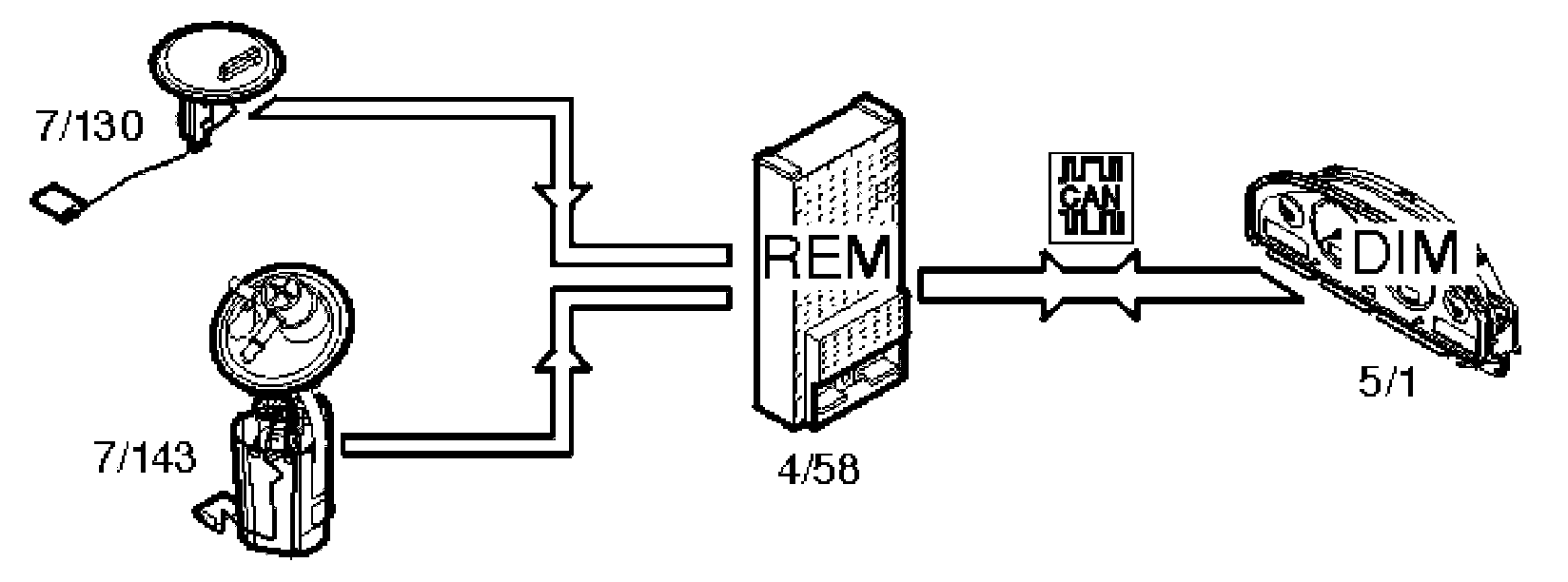 The fuel level is gauged by the fuel level sensors (7/130, 7/143). The signals from the sensors are transmitted to the rear electronic module (REM) (4/58). The rear electronic module (REM) calculates the quantity of fuel remaining by comparing the signals with a tank table stored in the rear electronic module (REM). Information about the quantity of fuel is transmitted via the Control area network (CAN) to the driver information module (DIM) (5/1) where the fuel level is displayed on the fuel gauge.
