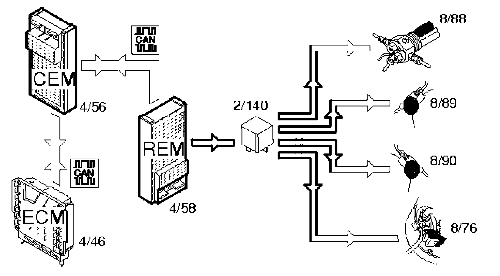 - Rear demist (9/2) is activated by pressing the switch on the climate control module (CCM) (3/112). The climate control module (CCM) transmits the data via the Control area network (CAN) to the central electronic module (CEM) (4/56). The central electronic module (CEM) checks that the conditions to start the demist have been met. If the conditions are met, a request is sent via the Control area network (CAN) to the rear electronic module (REM) (4/58) to activate the relay (2/82). The rear electronic module (REM) powers the relay and the demister is powered.