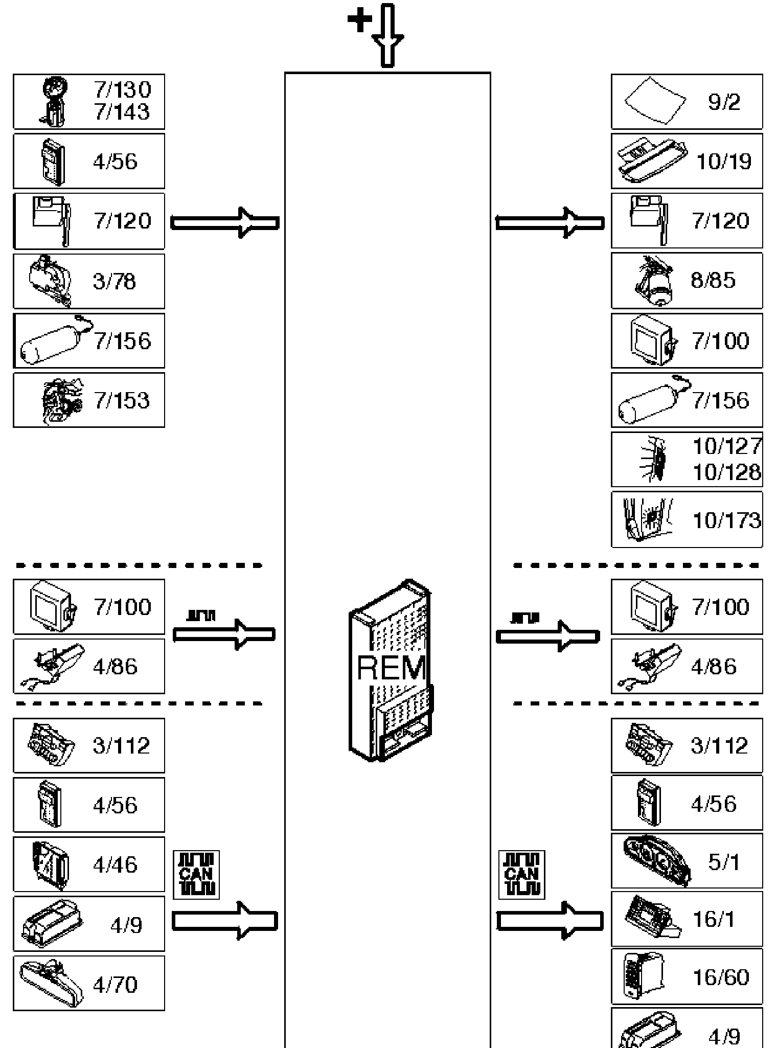 The following table summarizes input and output signals to and from the rear electronic module (REM). The signal types are divided into directly connected signals, serial communication and Controller area network (CAN) communication. The illustration below displays the same information with the Volvo component designations.