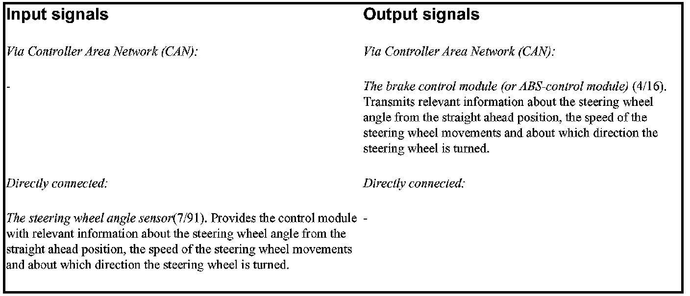 The Steering wheel Angle Sensor Module is positioned on the side of the central electronic module. The only function of the steering wheel angle sensor is to process the signals from the steering wheel angle sensor. The signals used by the DSTC system. The steering wheel angle sensor is mounted on the steering wheel module and is directly connected to the steering angle sensor via a connector on the steering wheel module. The Steering wheel angle sensor control module transmits signal information via the high-speed side of the Controller area network (CAN) to the brake control module, model year 2002- or the ABS control module, model year 1999-2001.
