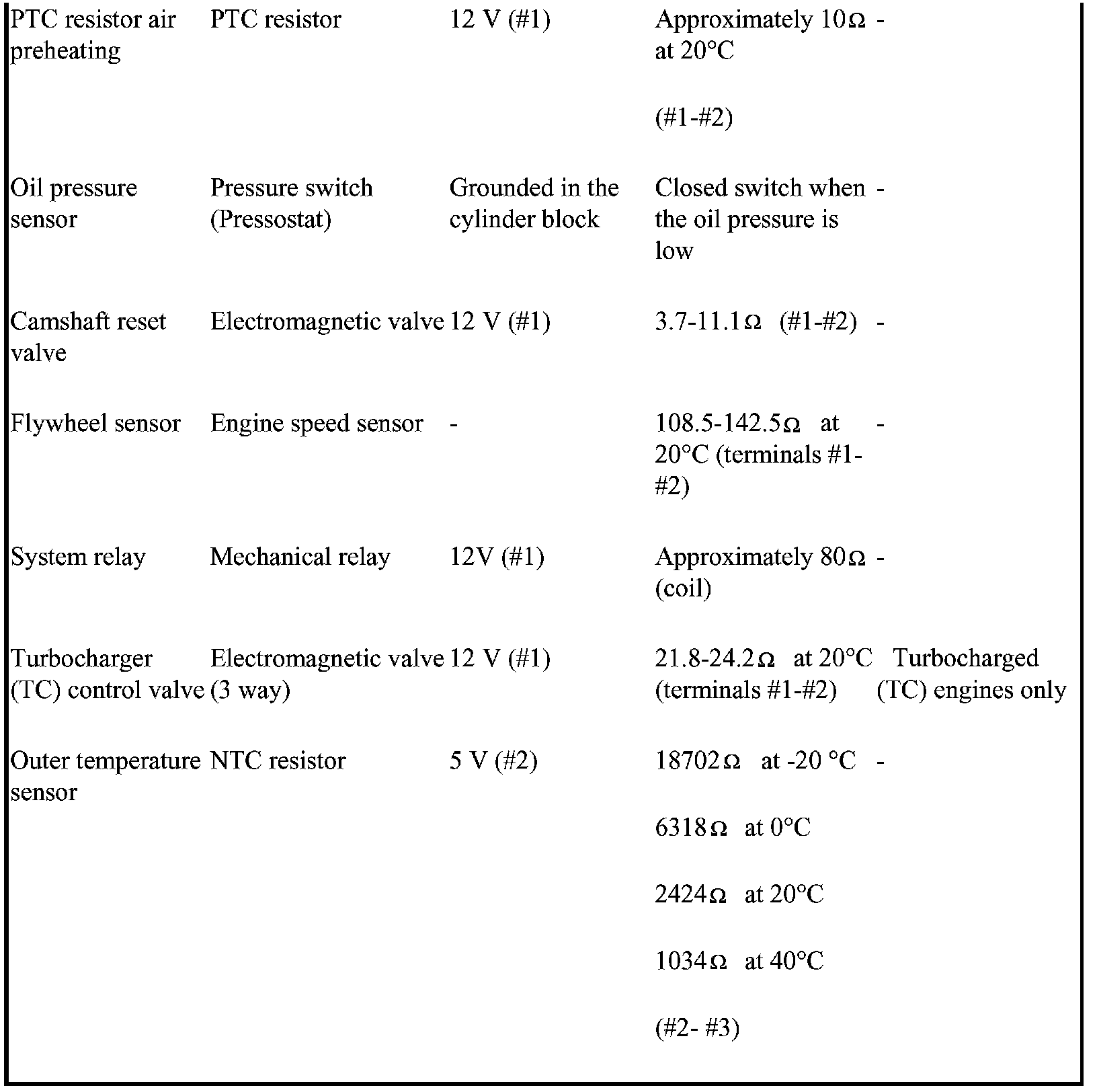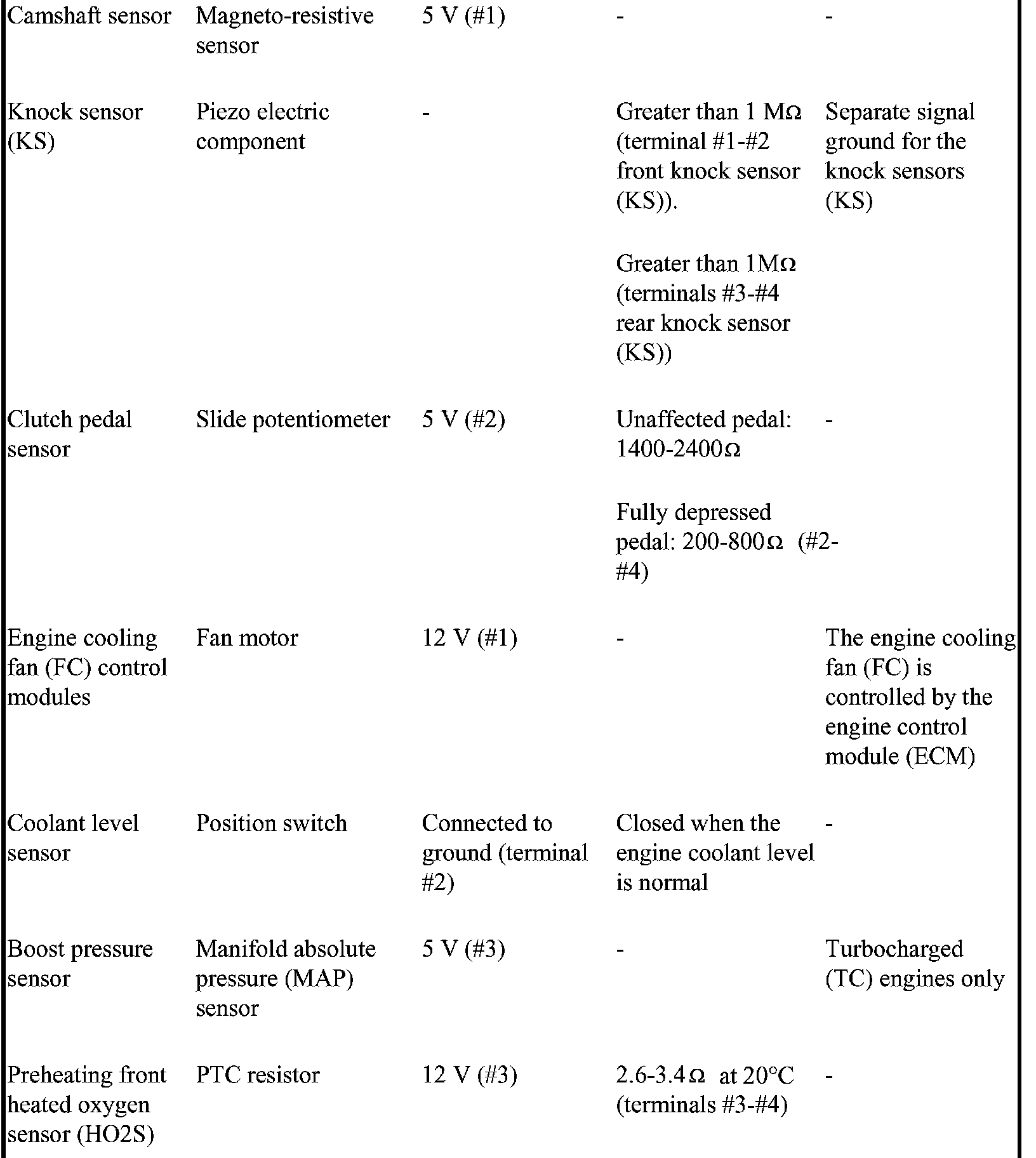 The component specification gives the value of the component when the connector is disconnected. Where no value is given, it is not possible to measure a relevant value at the component.