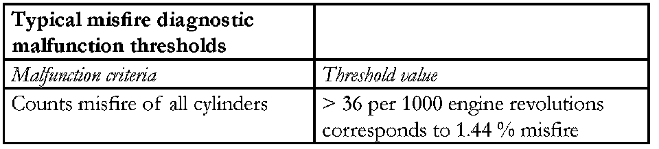 Misfire detection is enabled when the engine speed has reached 150 rpm below warm idle speed plus two crankshaft revolutions or after nine ignitions, depending on which occurs first. For detection of emission related misfires, the number of misfires which have occurred within the first interval of 1000 engine revolutions or the 4th exceedance (for the rest of DCY) over the emission threshold value after the first 1000 engine revolutions are relevant. If the number is so high that the exhaust emission standard is exceeded by a factor of 1.5, then the emission related misfire rate has been reached and exceeded a fault code will be stored. If misfires occur and the threshold is exceeded in the following DCY, MIL illuminates.