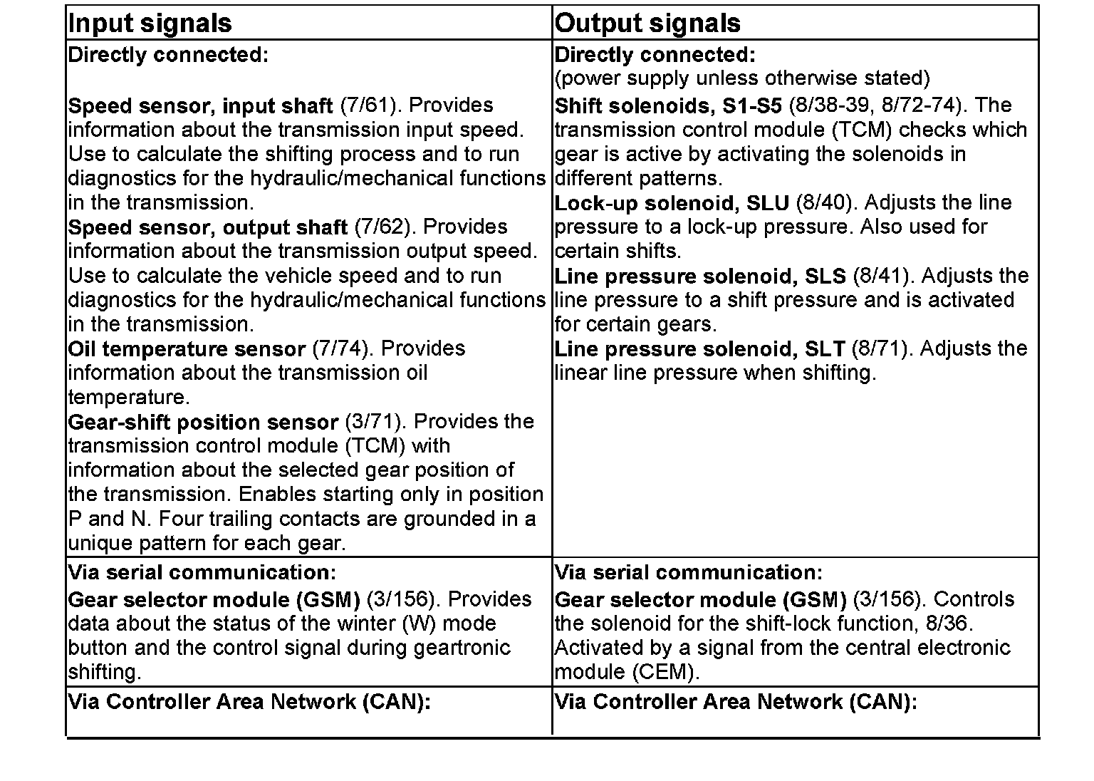 The table summarizes the input signals to and output signals from the transmission control module (TCM). The signal types are divided into directly connected signals, serial communication and Controller area network (CAN) communication. The following illustration displays the same information with the Volvo component designations.