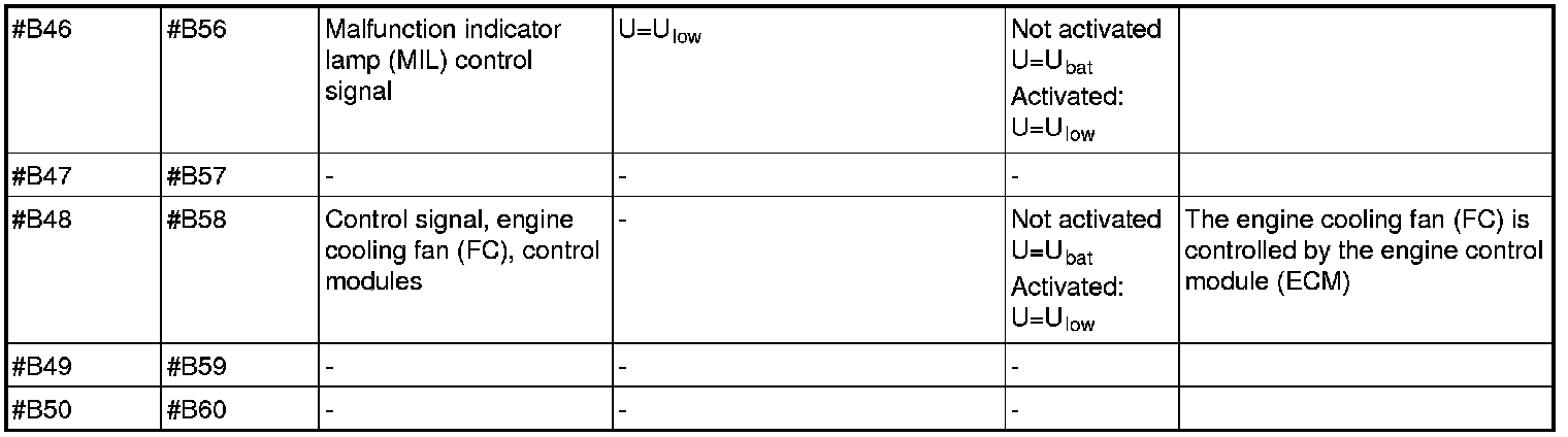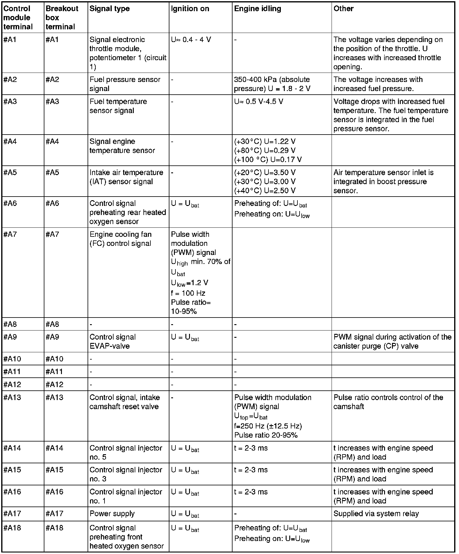 All values stated below are measured between each connection in column 1 (Conn. control module) and breakout box connection #B3 unless otherwise noted in column 6 (Other). The control module's connections #A1-#A70 correspond to #A1-#B10 on the breakout box, #B1-#B50 correspond to #B11- #B60 on the breakout box.