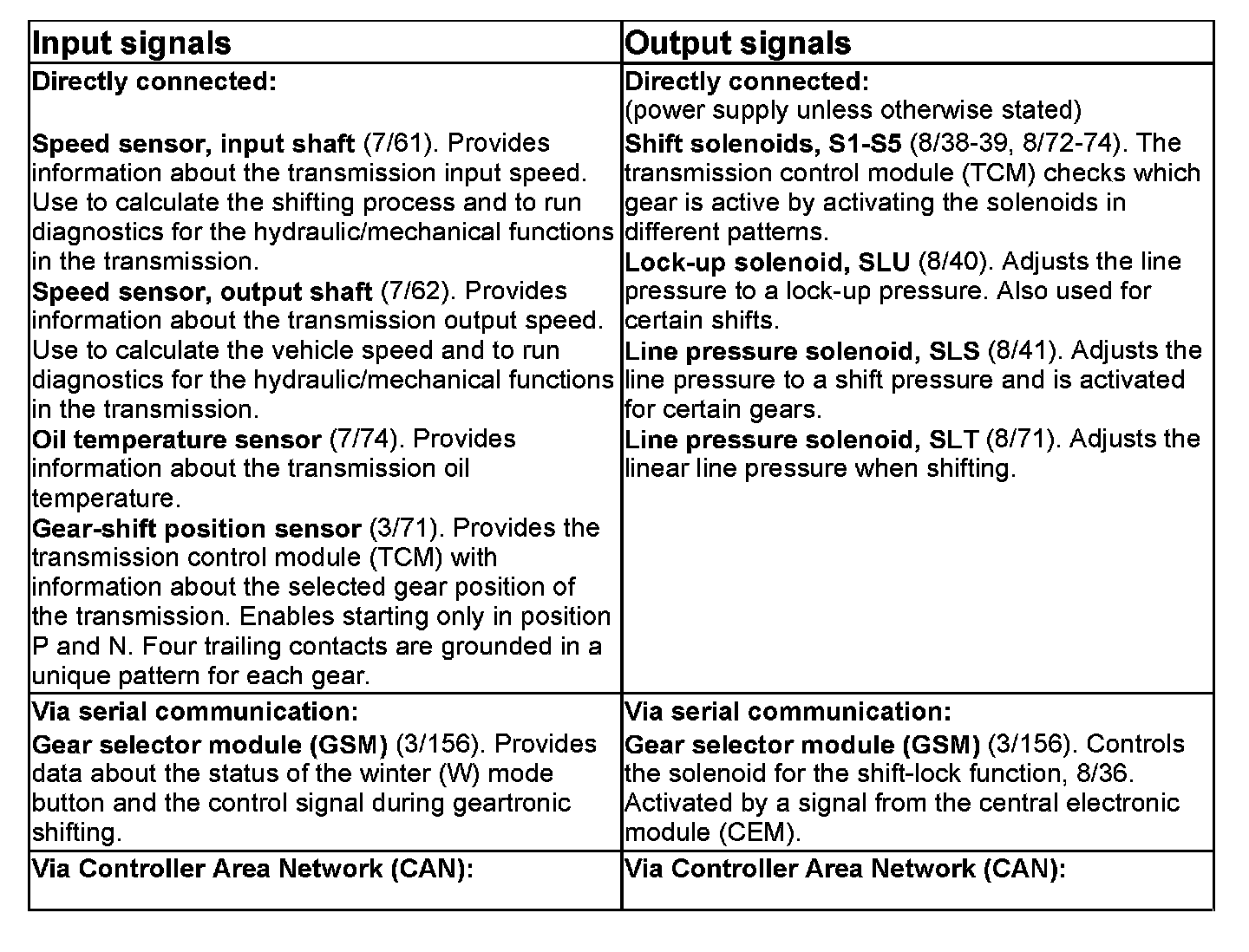 The table summarizes the input signals to and output signals from the transmission control module (TCM). The signal types are divided into directly connected signals, serial communication and Controller area network (CAN) communication. The following illustration displays the same information with the Volvo component designations.