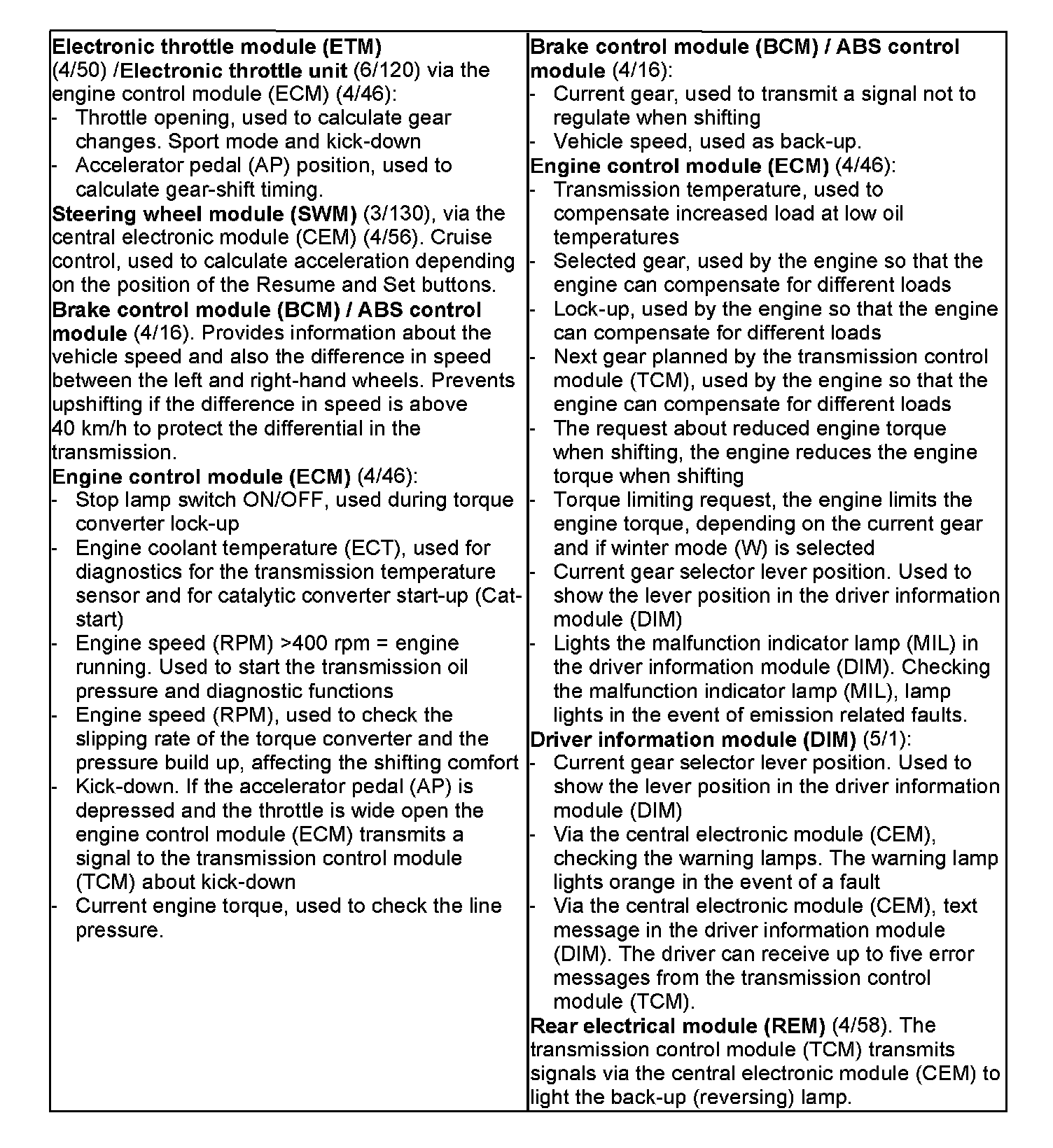 The transmission control module (TCM) receives information about the desired gear position and driving mode from the driver. In conjunction with the signals from a number of sensors in the transmission and the engine control system, unlike with a purely hydraulically controlled transmission, this allows the control module to calculate the optimal shifting points and engagement of lock-up. The control module allows for small changes in the operating conditions and adapts the various transmission functions to ensure that the correct gear is always selected in relation to the driving mode selected by the driver.