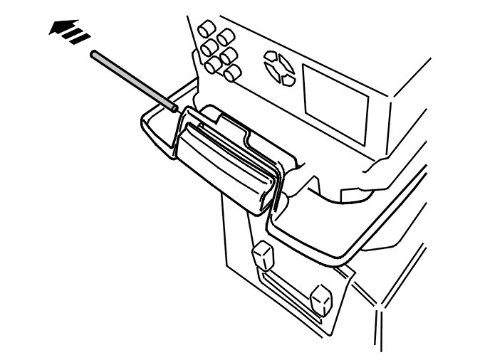 Remove the outer cover. See: Center console, replacing Service and Repair. Press the hinge shaft out towards the side (1). Release the handle.