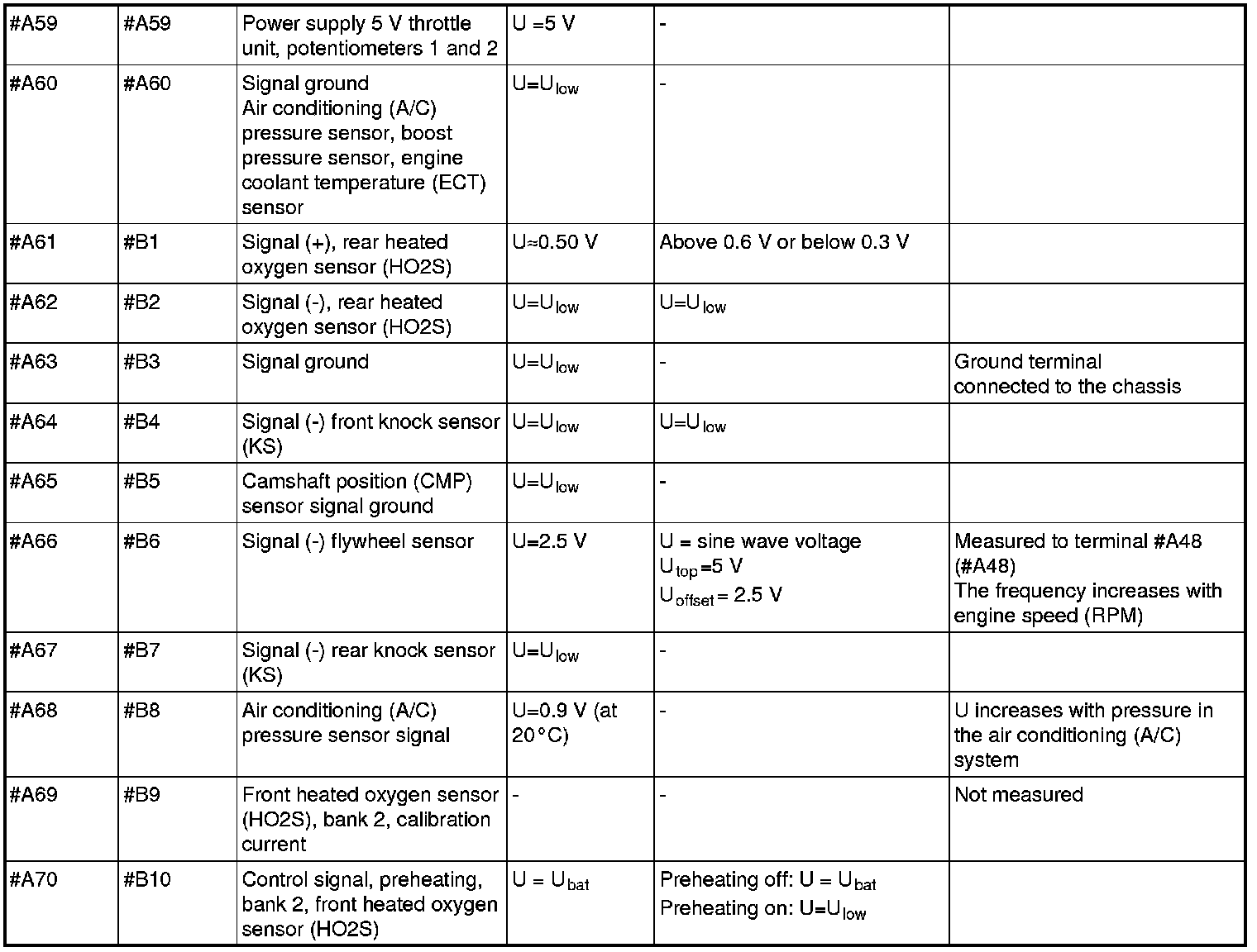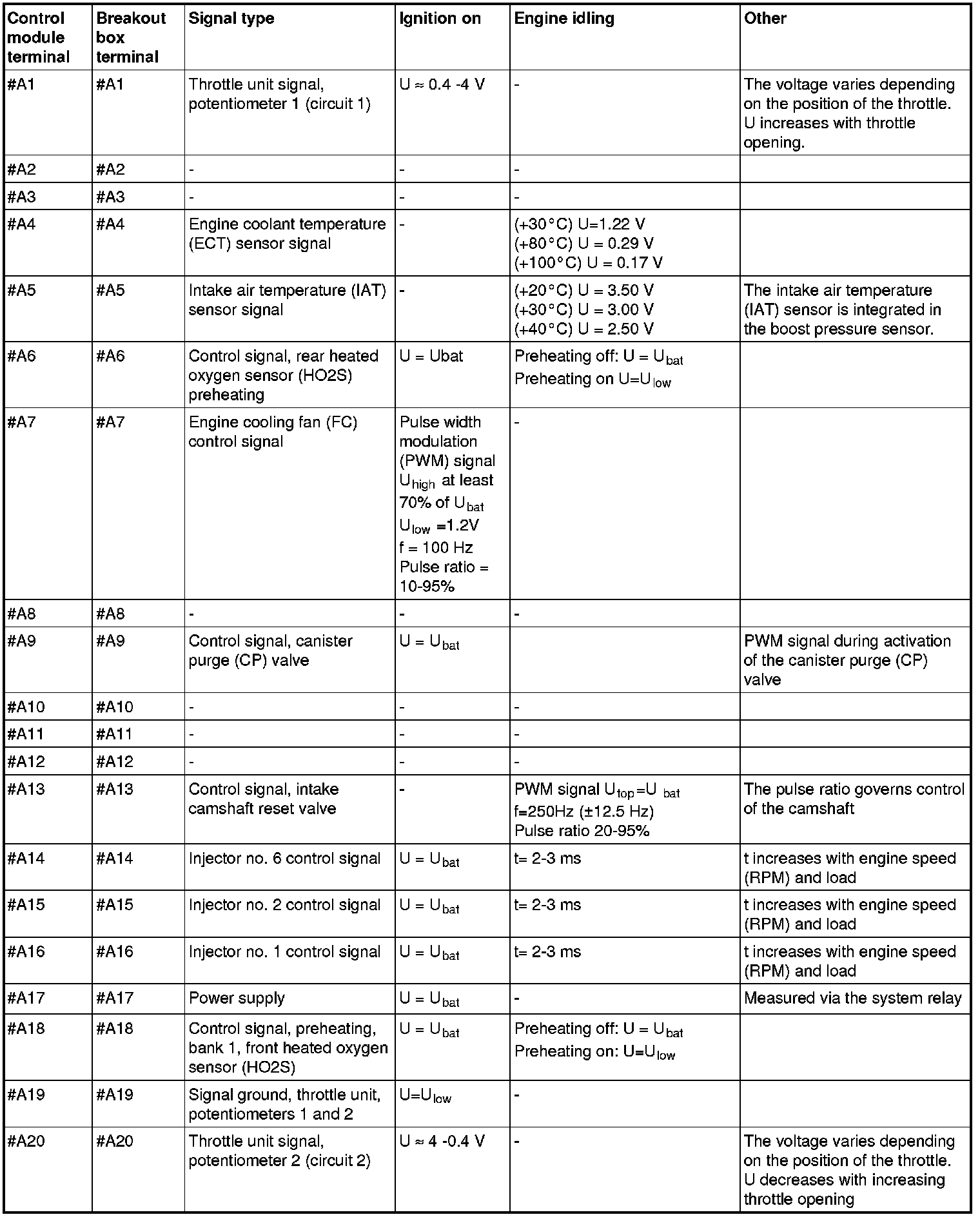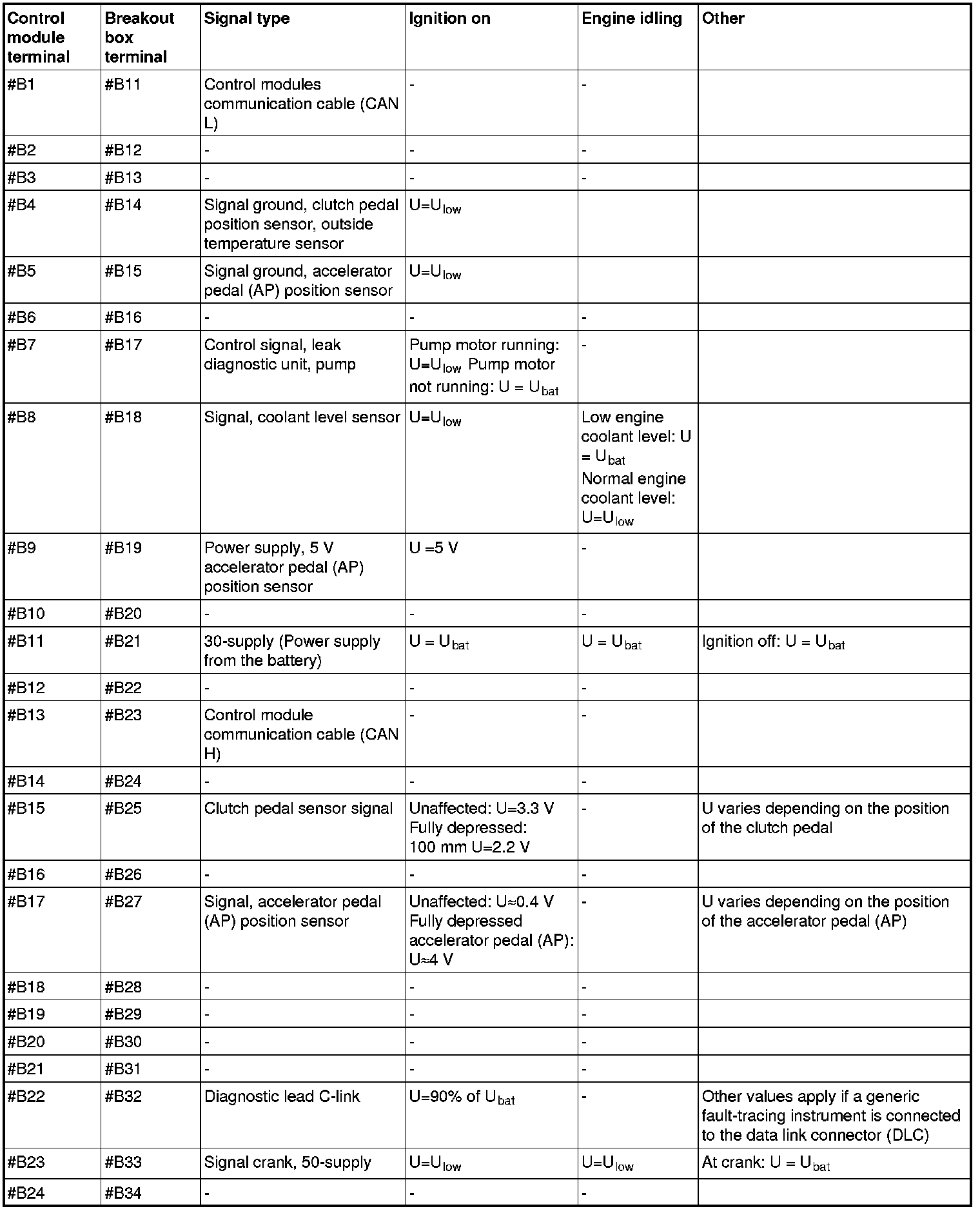 All values listed below should be measured between the respective terminal in column 1 (control module terminal) and terminal #B3 unless stated otherwise in column 6 (Other). Control module terminals #A1-#A70 correspond to terminals #A1-#B10 on the breakout box, terminals #B1-#B50 correspond to #B11 - #B60 on the breakout box.